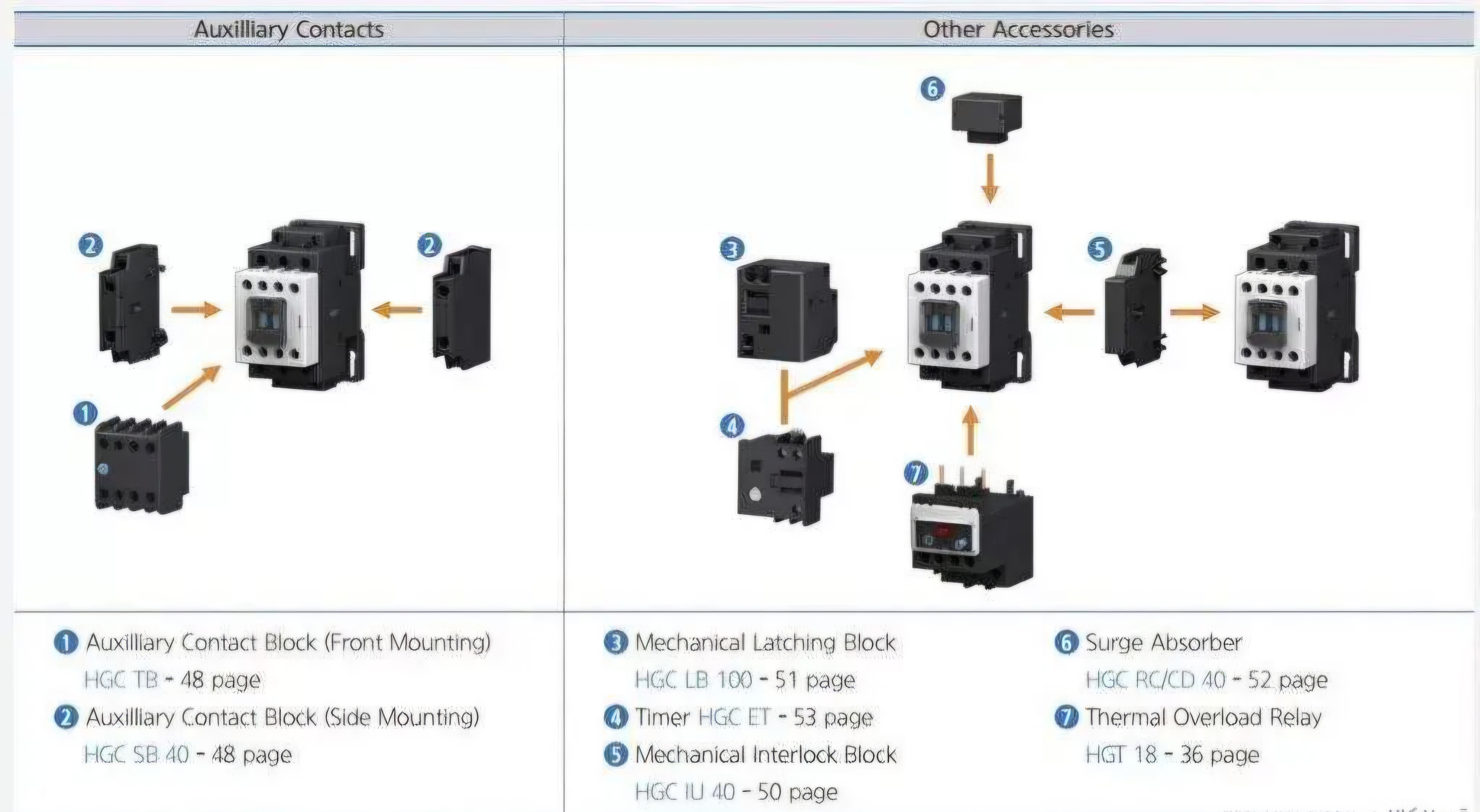 این کنتاکتورها در ۸ فریم موجود هستند که از لحاظ شکل ظاهری و ساختار کلی چهار فریم ۱۸، ۴۰،۶۵ و ۱۰۰ شبیه به هم بوده و چهار فریم ۱۵۰-۲۵۶-۵۰۰ و ۸۰۰ نیز شبیه به هم هستند که تنها در ابعاد تفاوت دارند. از مهمترین ویژگی کنتاکتور HYUNDAI مدل HGCB، دردسترسبودن این کنتاکتور و ارزانبودن آن نسبت به برندهای مشابه اروپایی است