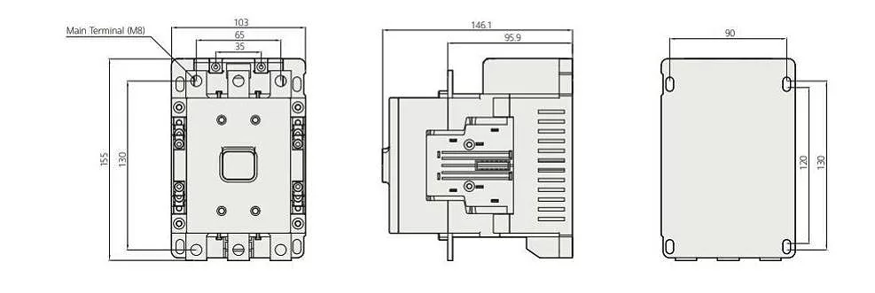 نقشه ابعاد کنتاکتور ۱۱۵ آمپر هیوندای را در شکل زیر مشاهده میکنید