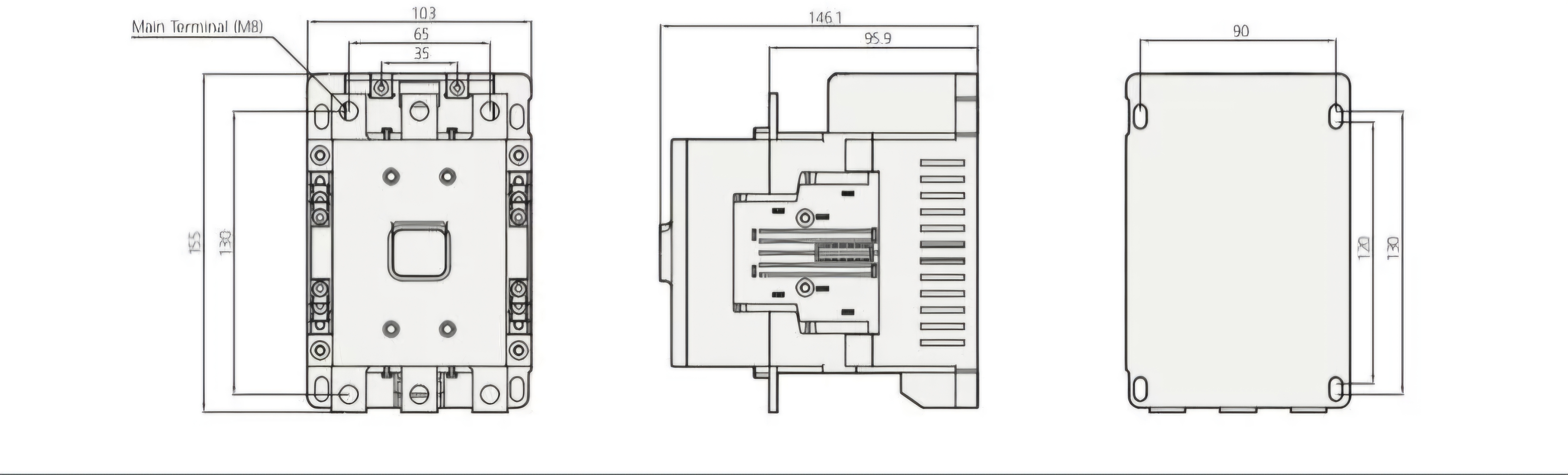 ابعاد کنتاکتور ۱۳۰ آمپر هیوندای را در شکل زیر مشاهده میکنید
